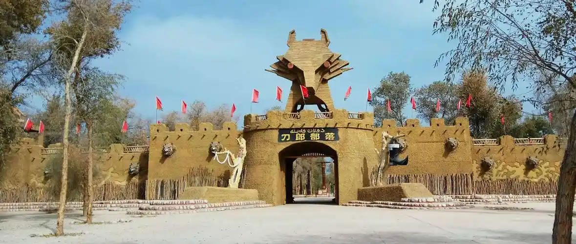 刀郎部落,位于新疆維吾爾自治區(qū)阿克蘇地區(qū)阿瓦提縣玉滿閘口胡楊林區(qū),距阿克蘇市58公里、縣城18公里,占地面積8300畝。景區(qū)以5000余畝千年原始胡楊林為生態(tài)背景,完整呈現(xiàn)刀郎人建筑、飲食及民俗文化,集中展示刀郎木卡姆、刀郎麥西熱甫等8項國家級和自治區(qū)級非物質文化遺產(chǎn),其中“刀郎演唱組合”保持著最大年齡民間歌舞組合的大世界基尼斯紀錄。核心功能區(qū)包含民俗展館、千年胡楊區(qū)、鴕鳥養(yǎng)殖園區(qū)等七大板塊,復原刀郎人傳統(tǒng)居所與勞作工具,設有傳統(tǒng)手工藝作坊和勇士競技場,每日開展刀郎麥西熱甫展演、民俗婚禮體驗及摔跤、叼羊等傳統(tǒng)體育活動。2025年入選非遺進景區(qū)“五好”案例名單,通過非遺傳承人駐場表演、慕薩萊思釀造工藝展示及沙雕主題公園等特色項目,形成生態(tài)觀光與民俗體驗深度融合的旅游模式。景區(qū)內(nèi)保留狩獵場景、農(nóng)民畫長廊及高空輪轉秋千表演,配套沉浸式互動體驗和文創(chuàng)開發(fā)體系,實現(xiàn)刀郎文化的活態(tài)傳承。