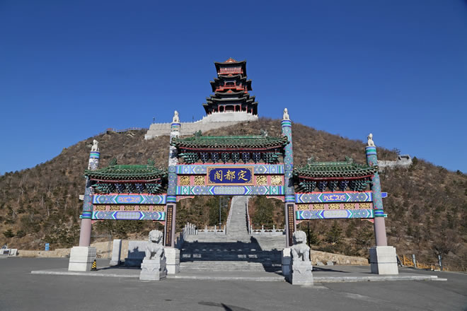 定都閣景區(qū)位于北京市門頭溝區(qū)潭柘寺鎮(zhèn)定都峰上,占地面積為550平方米,建筑面積約2400平方米,地上高度為33.9米,共有6層,外觀看為3層,為古色古香的中式建筑造型。定都峰,海拔680米,位于門頭溝區(qū)桑峪村東北獅山山頂,其位置正處在長安街向西的延長線上,是傳說中“燕王喜登定都峰,劉伯溫一夜建北京”的所在地。定都峰四周群山綿延逶迤,峻嶺疊嶂,山峰上巨石嶙峋,峰頂陡峭高懸,素有“不到定都峰,枉到北京城”和 “京西觀景第一峰”的美稱。傳說姚廣孝曾登頂定都峰,堪測地形再建北京,此后該山被稱為定都峰。明成祖朱棣登此山后曾感嘆不已:“此峰位之觀景之妙,無二可代,天賜也!”