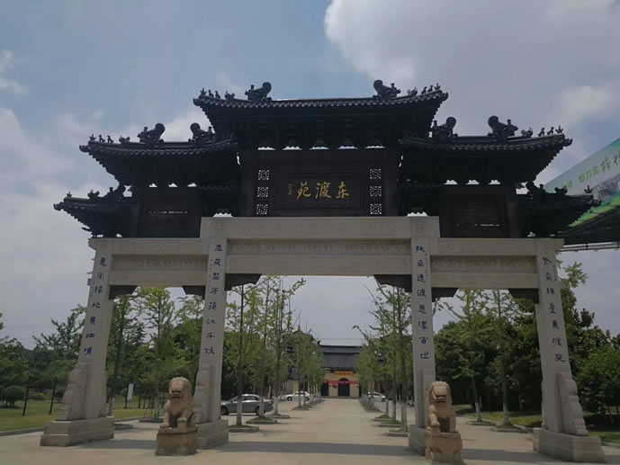 東渡苑景區(qū)位于江蘇省蘇州市張家港市塘橋鎮(zhèn),地處204國(guó)道與338省道交匯處,占地面積95300 m²。該地為公元753年唐代高僧鑒真第六次東渡日本成功的啟航地,古稱黃泗浦。據(jù)《沙洲縣志》記載:"唐高僧鑒真東渡日本連續(xù)五次失敗后,第六次于黃泗浦口啟航東渡成功。"1963年設(shè)立石質(zhì)經(jīng)幢作為紀(jì)念。景區(qū)包含鑒真東渡紀(jì)念館、東渡寺、碑亭等仿唐建筑群,其中主館供奉高2.06米的鑒真銅像,壁畫(huà)展現(xiàn)其第六次東渡歷程,后方木刻書(shū)屏節(jié)選《東征傳》記載第六次東渡細(xì)節(jié)。遺址區(qū)發(fā)現(xiàn)唐代河道、寺院類建筑遺存及石佛雕像,出土長(zhǎng)沙窯執(zhí)壺等外銷瓷器和宋代銘文磚,2013年列為全國(guó)重點(diǎn)文物保護(hù)單位,2018年入選全國(guó)十大考古新發(fā)現(xiàn)。景區(qū)現(xiàn)存東渡橋橫跨黃泗浦兩岸,橋側(cè)碑亭刻有阿倍仲麻呂詩(shī)作及郭沫若題詩(shī),種植雪松、桂花等50余種植物構(gòu)成江南水鄉(xiāng)景觀。