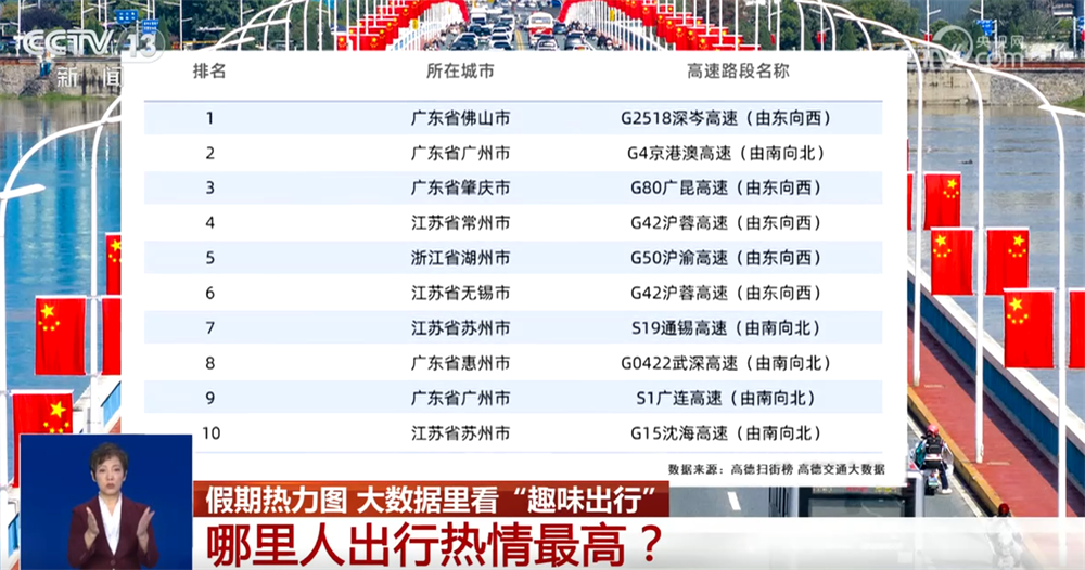 您知道哪里的人出行熱情高嗎?有網友說,聰明人都提前出門了。高德交通大數據顯示,10月1日0點至10點,全國十大繁忙出程高速路段中,長三角與粵港澳大灣區(qū)各占一半。其中,廣東的高速、火車站、機場等繁忙程度全面領跑全國。同時段全國十大繁忙高速服務區(qū)中,廣東占8席,江蘇占2席,廣東人的長假出門熱情領跑全國。