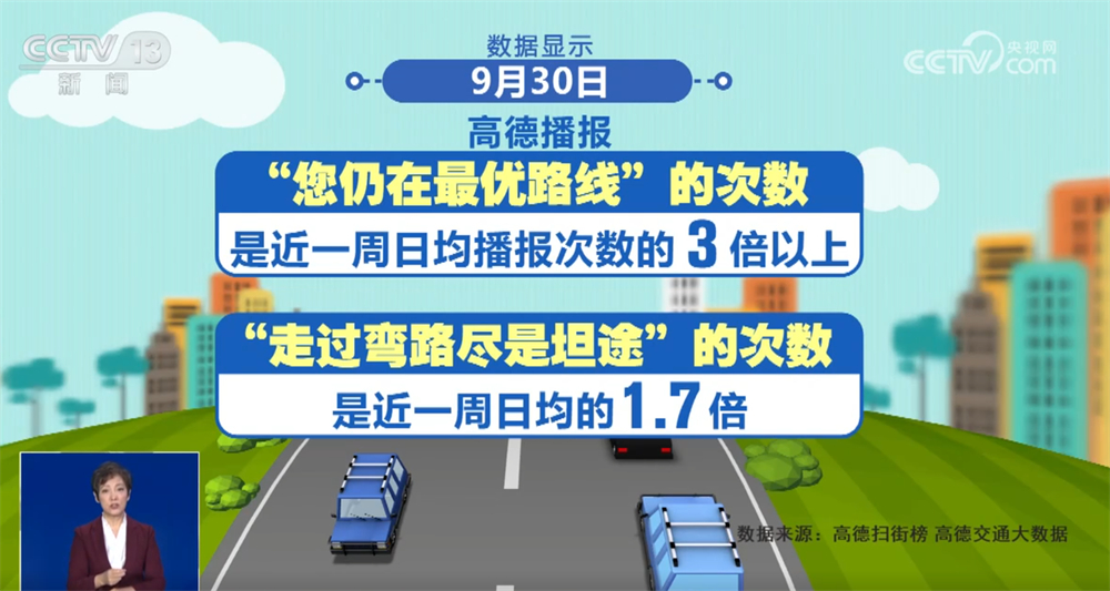我們再來看一個有趣的數據。“雖然前方擁堵,但您仍在最優(yōu)路線上”“今天走過了所有彎路,從此人生盡是坦途”,高德導航的“勸堵”金句與長假出行實時相伴。數據顯示,9月30日,高德播報“您仍在最優(yōu)路線”的次數是近一周日均播報次數的3倍以上,播報“走過彎路盡是坦途”的次數是近一周日均的1.7倍,可見自駕出行的人越來越多。不過,也有重慶網友表示“扎心”,“走過彎路還是彎路,坦途這句等我開出重慶再說。”