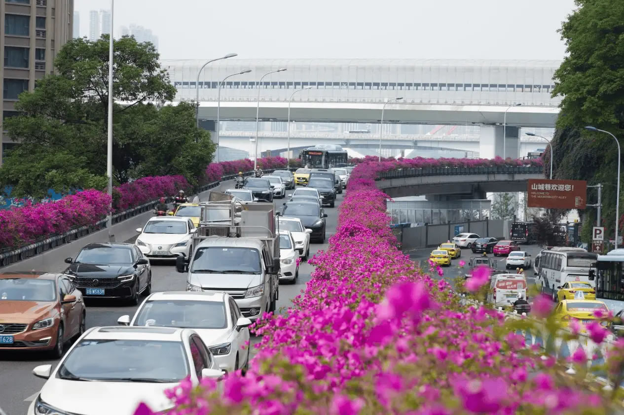 依托密集的立體交通網(wǎng)絡,渝中區(qū)聚焦立交高架、人行天橋、軌道墩柱,打造四季有綠、全年可觀的路上風景線,賦予城市交通色彩與活力。渝中區(qū)充分利用中興路高架橋兩側(cè)空間,通過鋼結(jié)構(gòu)支撐,加掛耐修剪、易養(yǎng)護的三角梅花箱,形成500米空中花廊。