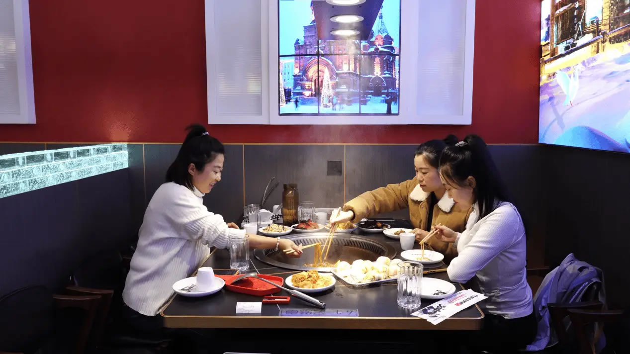 走進(jìn)同江市一家人氣很旺的鐵鍋燉餐館,濃郁的肉香混雜著酸菜的清爽撲面而來,鐵鍋里的大鵝與酸菜咕嘟作響,店內(nèi)十余張餐桌座無虛席,食客們的談笑聲與鐵鍋的燉煮聲交織成冬日里熱鬧的煙火氣。這是同江商家搶抓冰雪季商機(jī)推出特色優(yōu)惠套餐帶來的人氣。