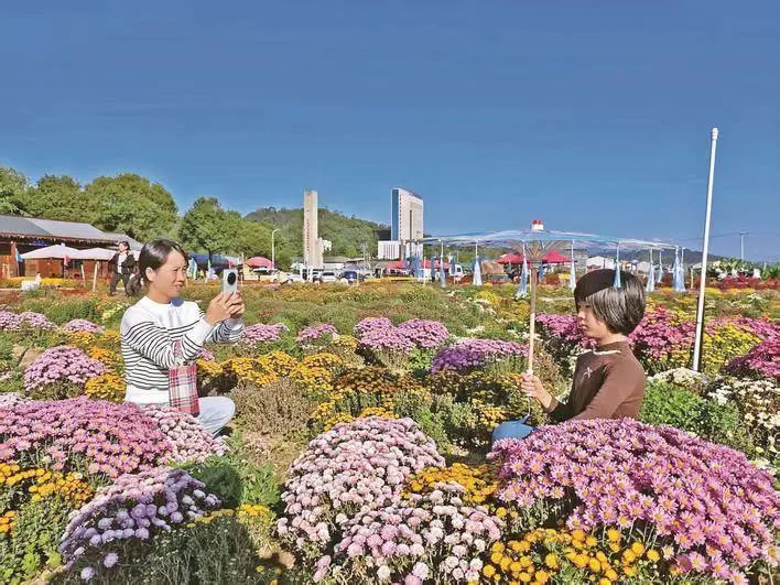 初冬暖陽下,沙縣區(qū)中國菊花種質資源保存中心南方分中心基地內繁花似錦。30多個菊花品種次第綻放,切花菊、地被菊、食用菊等繽紛鋪展,10余畝菊田進入最佳觀賞期,吸引眾多市民前來賞菊。