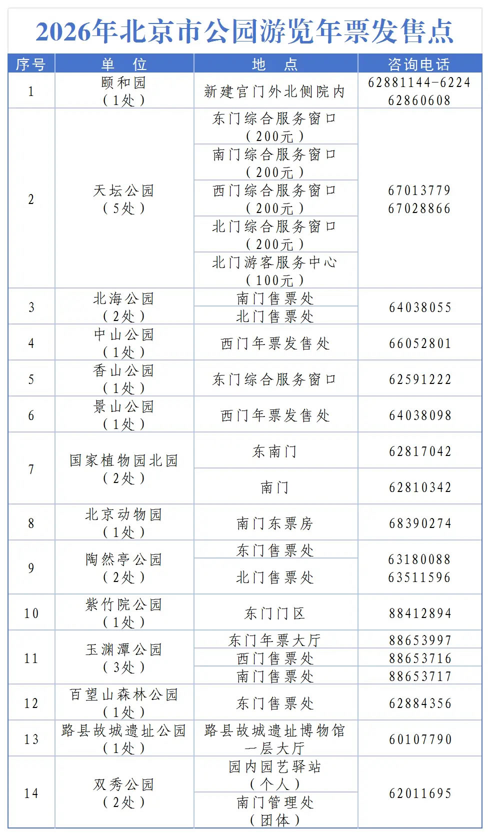 北京市公園游覽年票(100元)適用頤和園、天壇公園、北海公園、中山公園、香山公園、景山公園、國(guó)家植物園北園、北京動(dòng)物園、陶然亭公園、玉淵潭公園、百望山森林公園、雙秀公園、北京國(guó)際雕塑公園、大觀園、地壇公園、水立方。使用時(shí)限為2026年1月1日到2027年1月31日。
